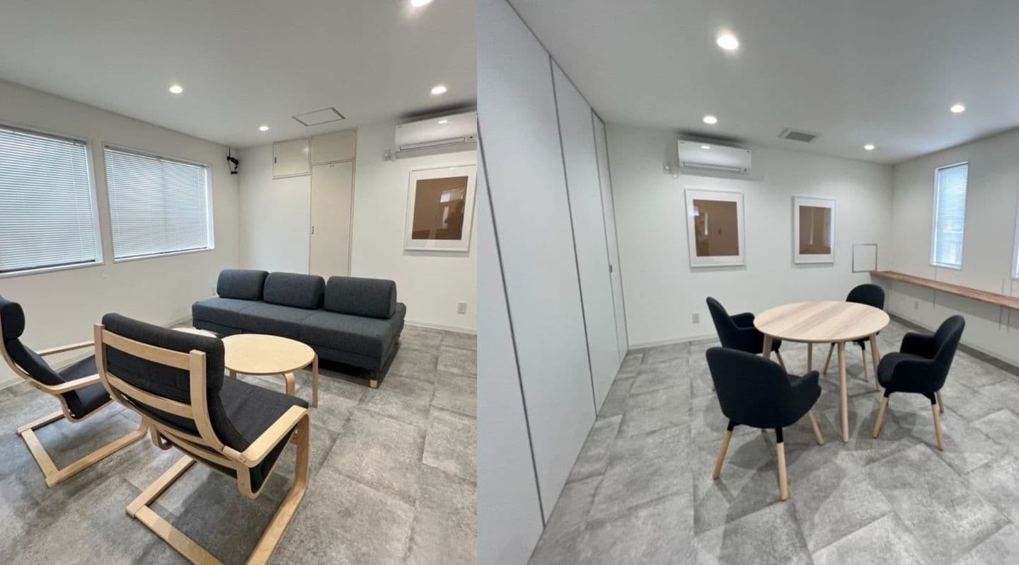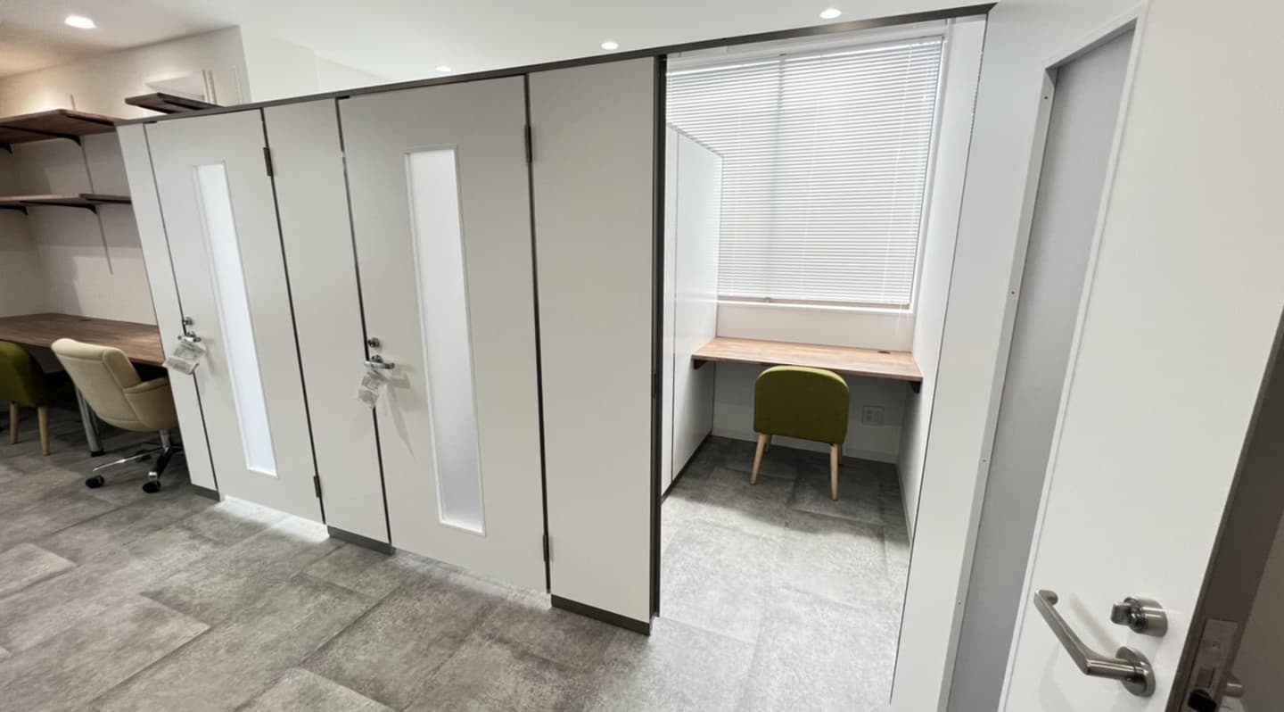 リモートワークや集中して作業したい時に最適な、個室スペースも完備しております。シェアオフィスではプライバシーが・・・という課題もしっかりとプライバシーを確保できるスペースを設けました。事務作業など面倒な作業も、しっかりと集中できる環境を完備しておりますので捗ります。